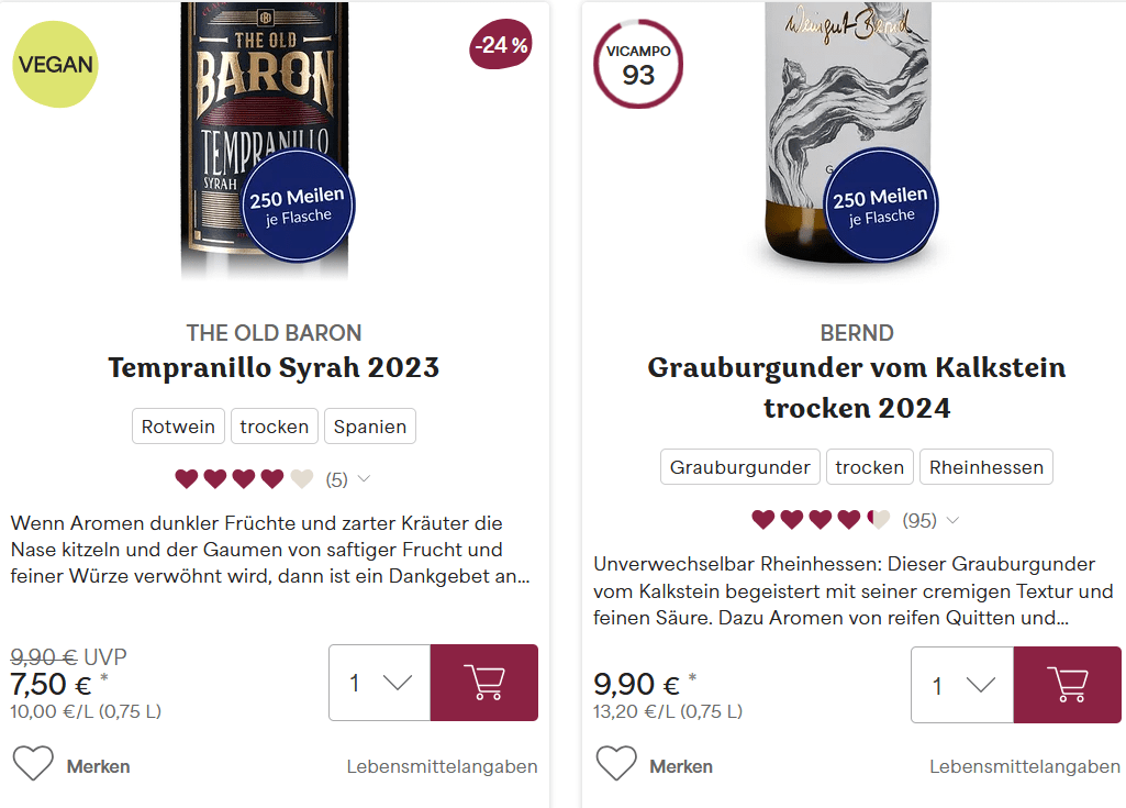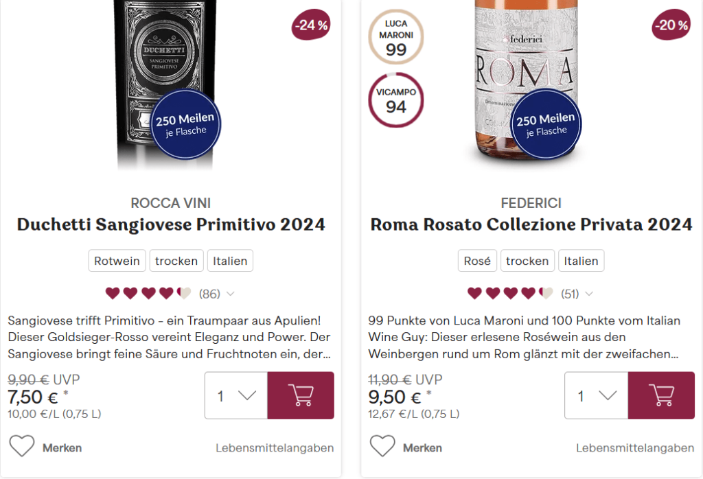 Für uns Meilensammler ist das Angebot von Vicampo interessant, weil man bei jeder Bestellung mindestens 50 Miles & More Meilen pro Flasche sammeln kann. Jeden Monat gibt es bei ausgewählten Artikeln im Angebot sogar bis zu 500 Meilen.