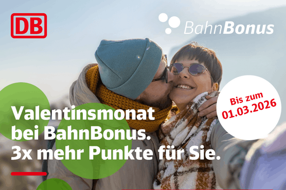 Im Februar läuft bei BahnBonus eine befristete Punkteaktion. Registrierte Teilnehmer erhalten für Buchungen und Fahrten innerhalb Deutschlands bis zum 1. März 2026 die dreifache Anzahl an Prämienpunkten.