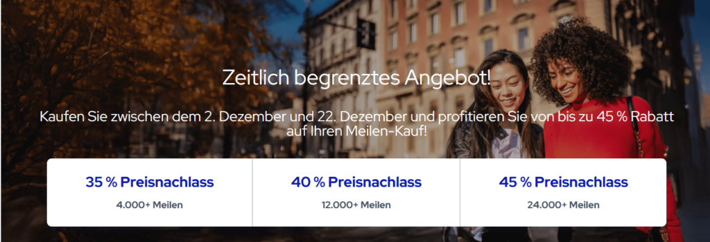 Flying Blue Meilen kaufen wird im Dezember richtig spannend. Zwischen dem 2. und 22. Dezember 2025 läuft eine kurze, aber attraktive Aktion, bei der du bis zu 45 Prozent Rabatt auf deinen Meilenkauf erhältst.