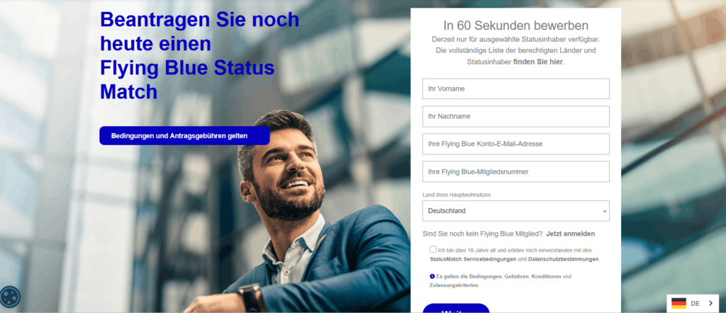 - Die Bearbeitung erfolgt über flyingblue.statusmatch.com, nicht direkt durch Flying Blue
