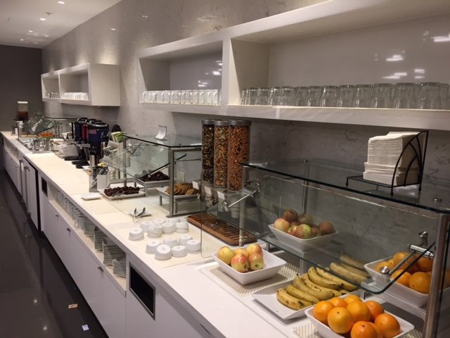 Es gibt ausreichend Obst, warme und kalte Snacks – insgesamt eine deutlich bessere Versorgung als im Admirals Club.