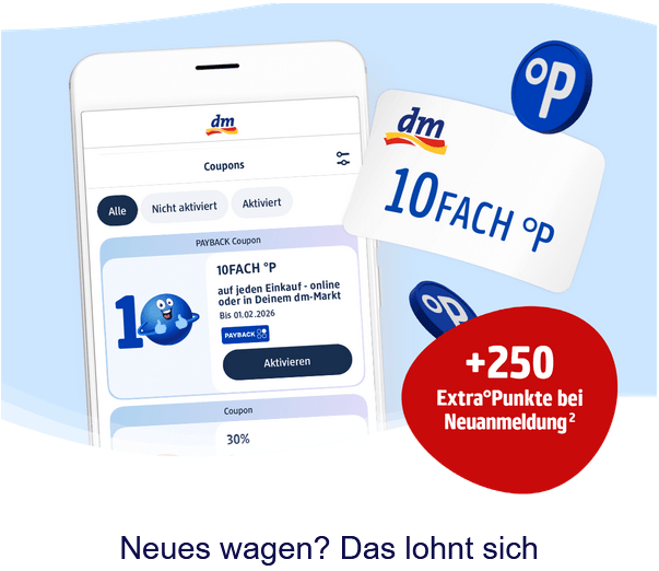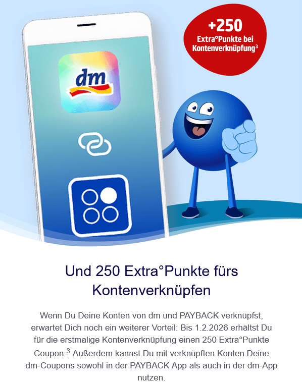 Auch für die erstmalige Verknüpfung des dm-Kontos mit PAYBACK gibt es 250 Extra-Punkte. Diese kommen in Form eines eCoupons, der nach Erhalt 28 Tage gültig ist und einmal eingelöst werden kann.